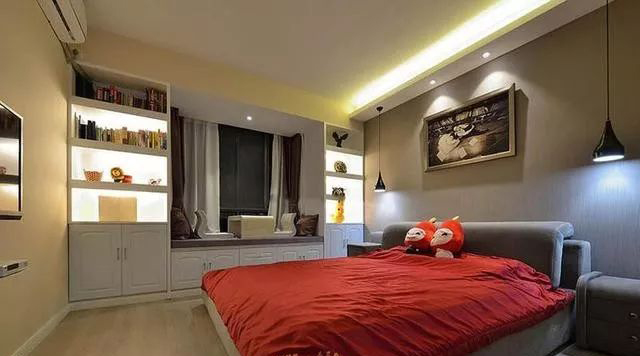 窗戶兩邊是隔板柜的設(shè)計(jì),里面安裝了氛圍燈,在燈光的映襯下,看上去非常的精致敞亮了,在飄窗上擺放了一張精致的茶臺,搭配上舒適的坐墊,在這里可以一邊喝茶一邊欣賞外面的景色,非常愜意。
