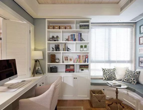 如果家里房間有飄窗話,還可以把飄窗改造成書房書桌。巧妙的空間利用,干凈的色彩以及簡(jiǎn)約的設(shè)計(jì)讓閱讀空間更輕松安靜,也整個(gè)空間更自由舒適。直接利用飄窗的位置,做個(gè)柜子,將飄窗設(shè)計(jì)成小書房,同時(shí)也讓房間不顯單調(diào)。