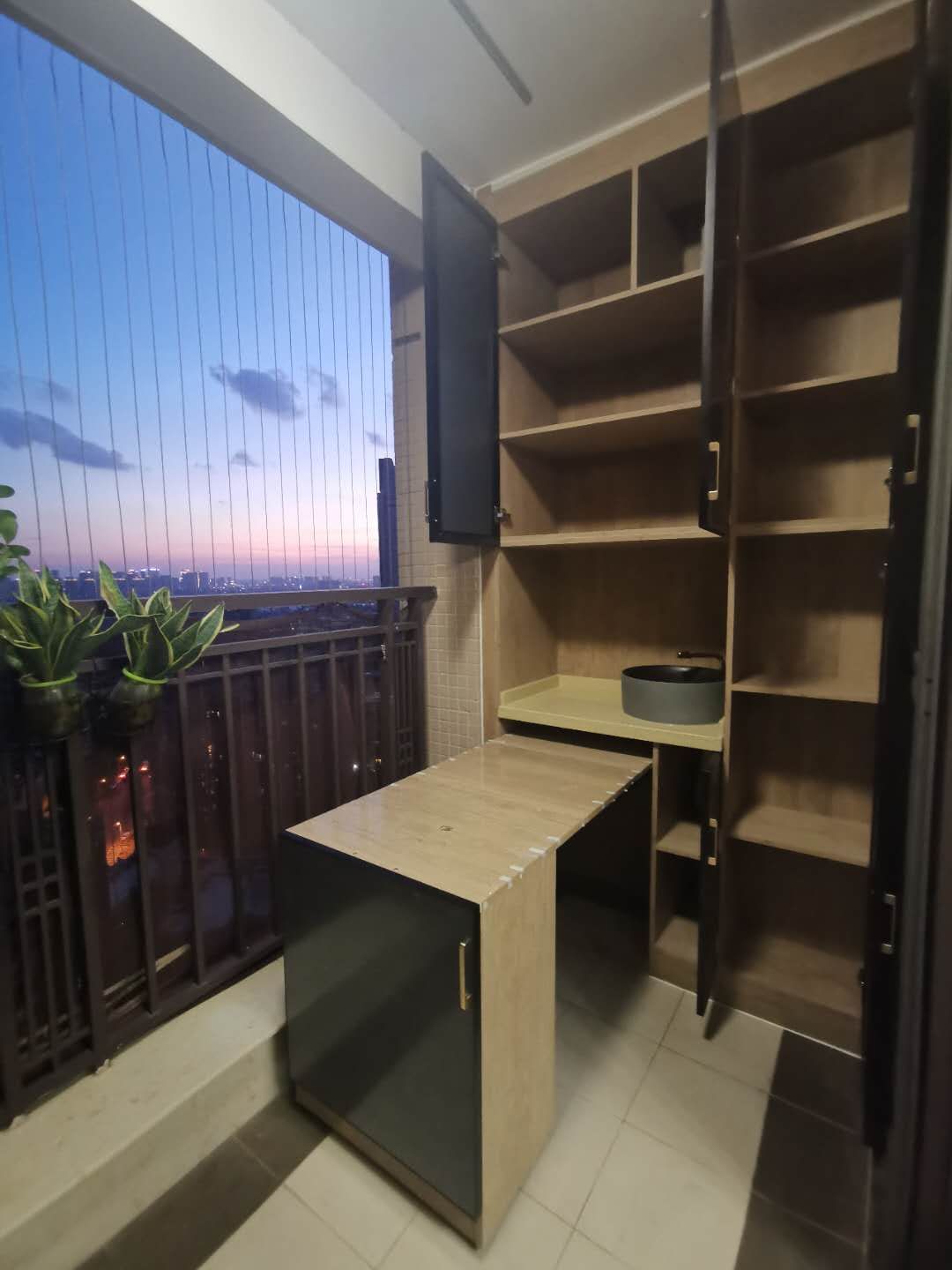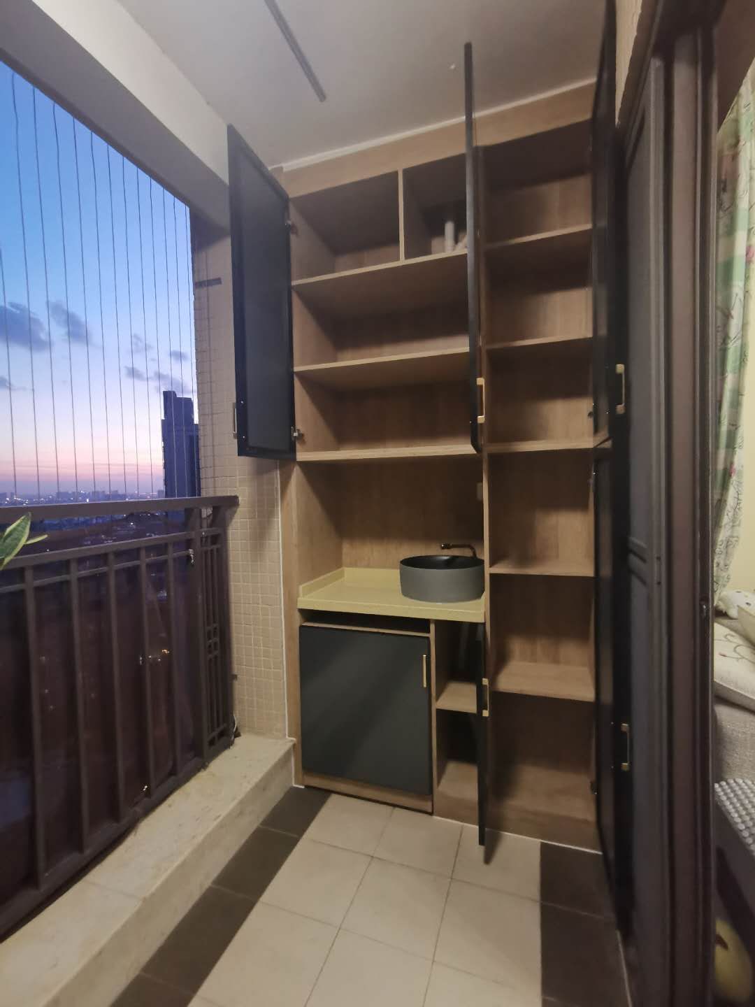 柜體用的是整板北歐榆木,柜門用的是輕奢風(fēng)的極簡窄邊門,星空灰的顏色與陽臺推拉門、防護(hù)欄是同一色系,達(dá)到了和諧統(tǒng)一。柜子拉開可喝茶、練字,夏天的夜晚可以坐在陽臺一邊吹風(fēng)一邊欣賞整個(gè)城市的夜景,好不愜意!