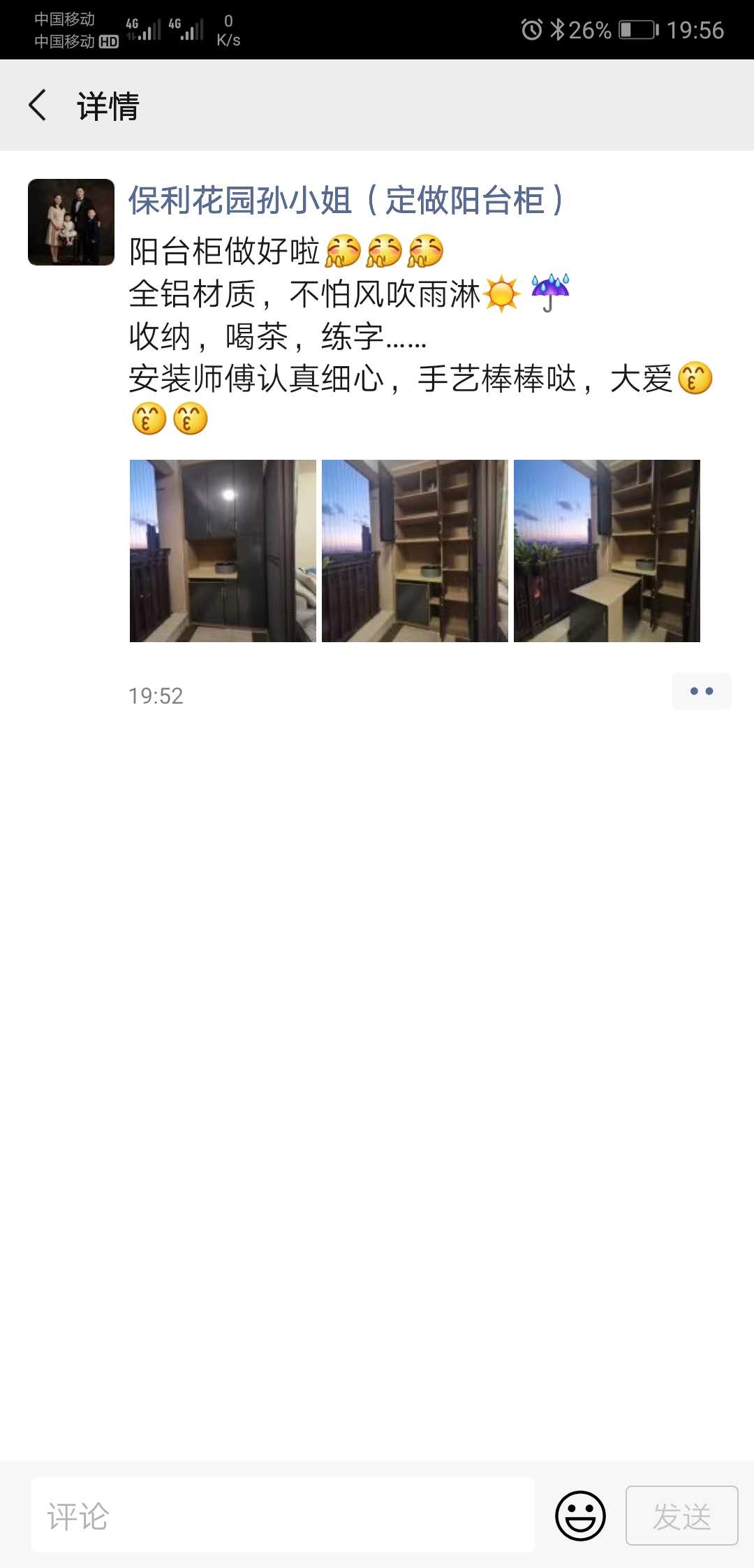 不用的時(shí)候可以隱藏起來不占地方,全鋁材質(zhì),不怕風(fēng)吹日曬雨淋,超大收納!安裝好后孫小姐也特別滿意,謝謝認(rèn)可!