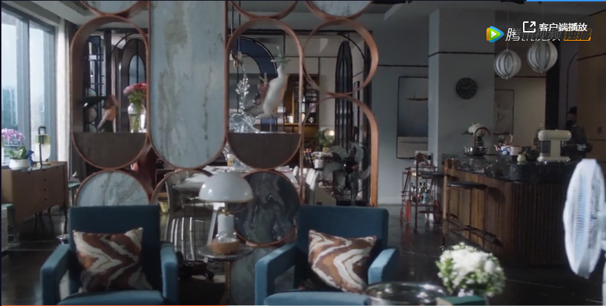 劇中顧佳的家,原型是滬上著名豪宅,房屋是開放式的格局,客廳與餐廳采用了簡單的屏風進行隔斷,整體比較通透,莫蘭迪藍+金屬線條+棕色的組合,極具現(xiàn)代輕奢感。