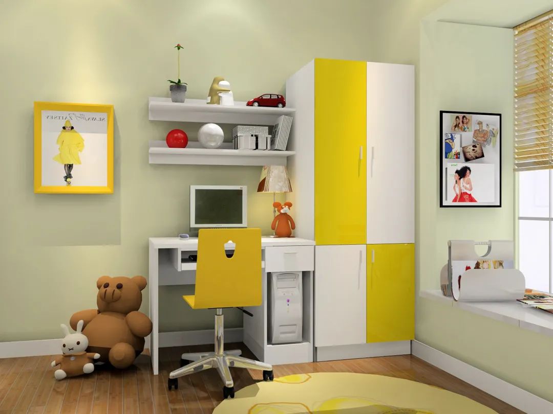對(duì)于兒童房來說,可以選擇一些亮麗、清新的色彩作為衣柜門,比如藍(lán)色、黃色、綠色等,搭配卡通范的掛畫、墻貼,更有活力。