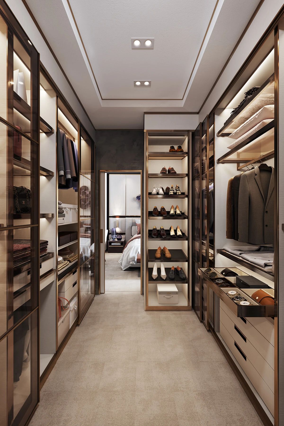 還可以直接用玻璃極窄門來作為衣柜門,這樣可以直接一眼看到衣柜內(nèi)部的擺設(shè),想要拿取衣服的時(shí)候就更加方便了。