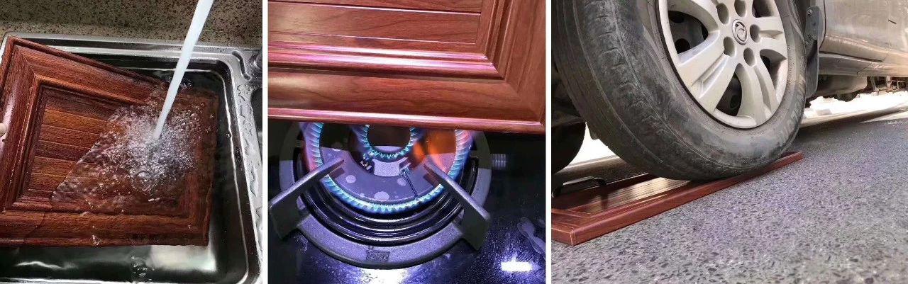 用打火機(jī)測(cè)試,顆粒復(fù)合板家居明顯的灼燒痕跡,木紋鋁板家居沒有絲毫灼燒痕跡,木紋鋁板家居完全不怕明火的傷害。