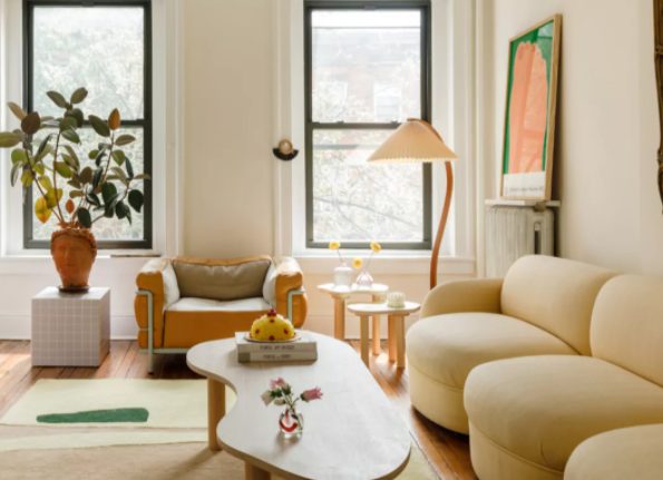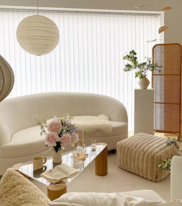 奶茶風(fēng)首先是奶茶色,也就是整體的膚感裸色。它由米白色、米黃色、暖灰色,白色,以及原木色組成,輕到可以飄起來,唯一的重色就是較深的木料,或綠植的墨綠色。
