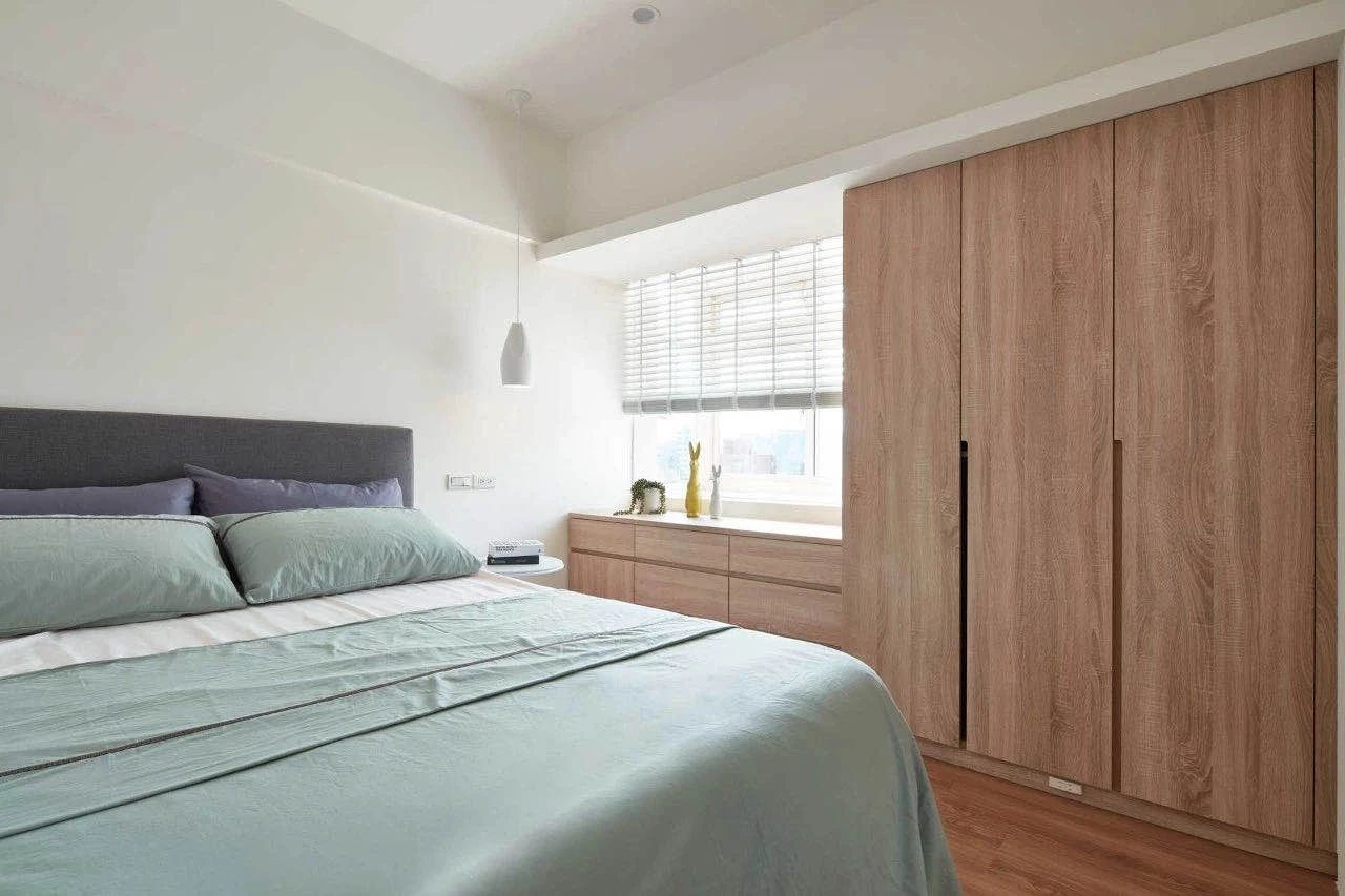 把全鋁衣柜和床頭背景墻的收納設(shè)計結(jié)合在一起,都選擇原木紋色作為柜門,這樣的臥室讓人感覺格外的溫馨、舒適。