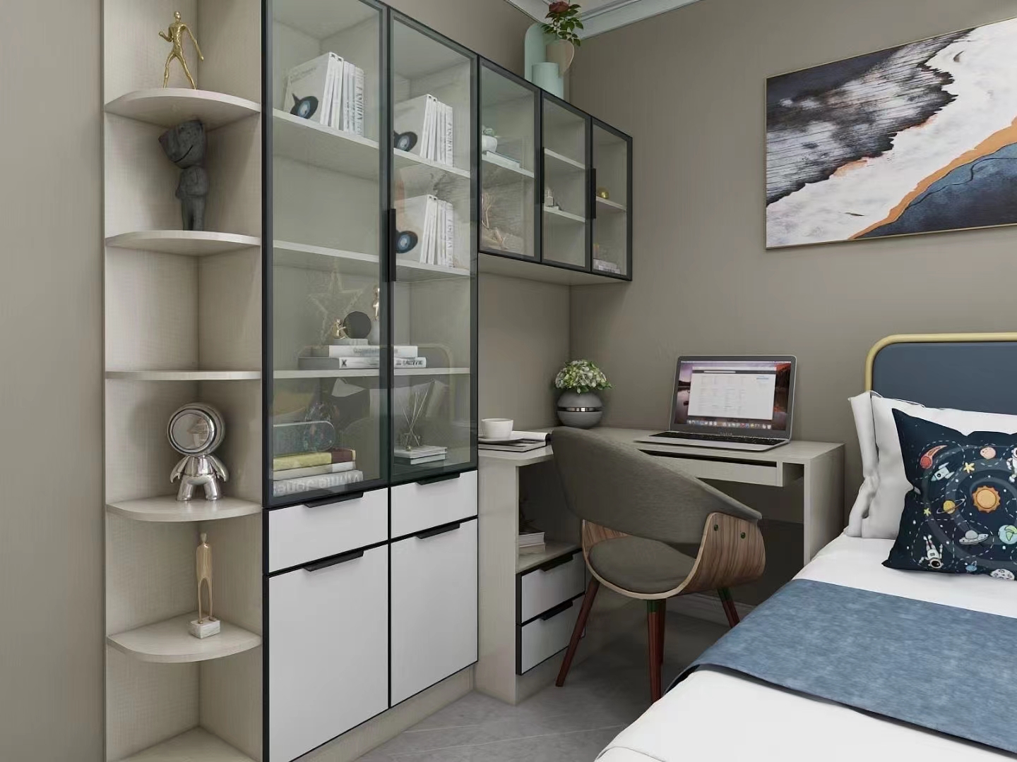 半開放式的柜門,能夠彌補柜門對空間的占用,美觀好看,只不過價格更貴一些,而且開放式的空間容易積灰,但也是個不錯的選擇。