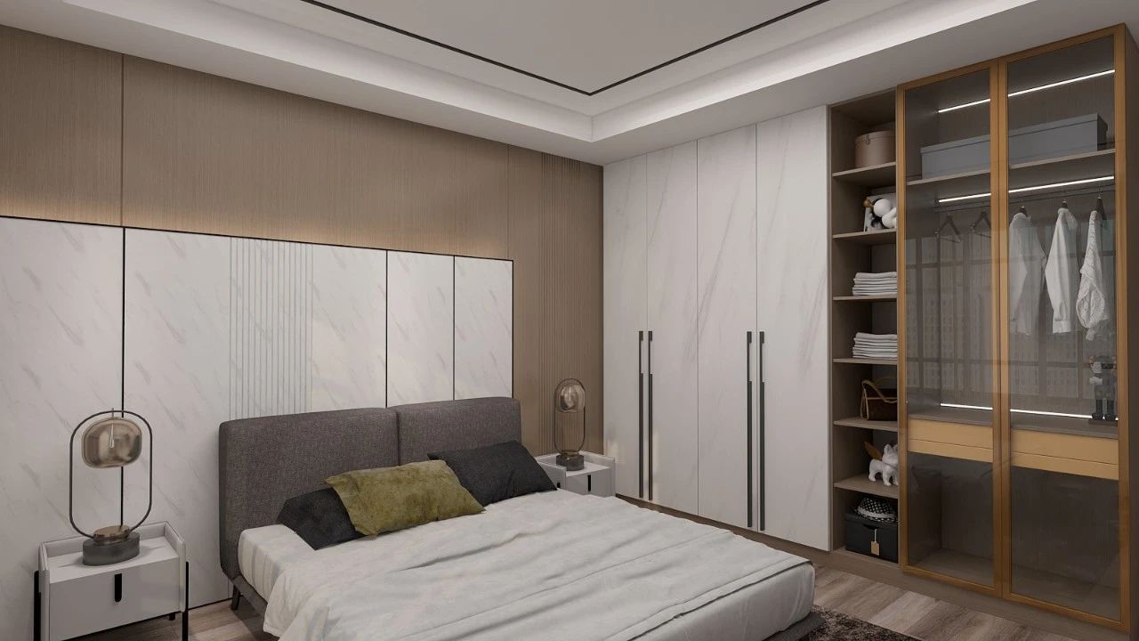利用臥室設(shè)計(jì)嵌入式全鋁衣帽間,將整個(gè)柜體融入墻里,柜體與墻面保持一致,既不占用原本的臥室空間,又保證儲(chǔ)物空間極致應(yīng)用;柜門選用膚感白鋁門板,營造出靜謐樸素的臥室環(huán)境,透明玻璃對(duì)開門,讓衣物了然于眼前,提升臥室高貴氣質(zhì)感。