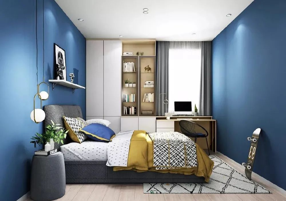 整個房間由床+全鋁床頭柜+全鋁書桌+全鋁衣柜組成,亮點(diǎn)是圍繞床頭背景打造成整墻柜,上方吊柜和下方矮柜都可以用來收納雜物,中間的開放格可以用來放書,滿足一間房的所有收納需求!