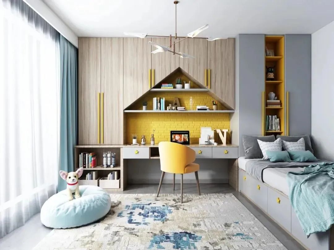 兒童房在配飾方面可以卡通一點(diǎn),顏色豐富一些,會使整體空間更溫馨舒適。學(xué)習(xí)區(qū)域要有好的光照條件,在窗戶旁邊,對孩子的身體更有幫助。