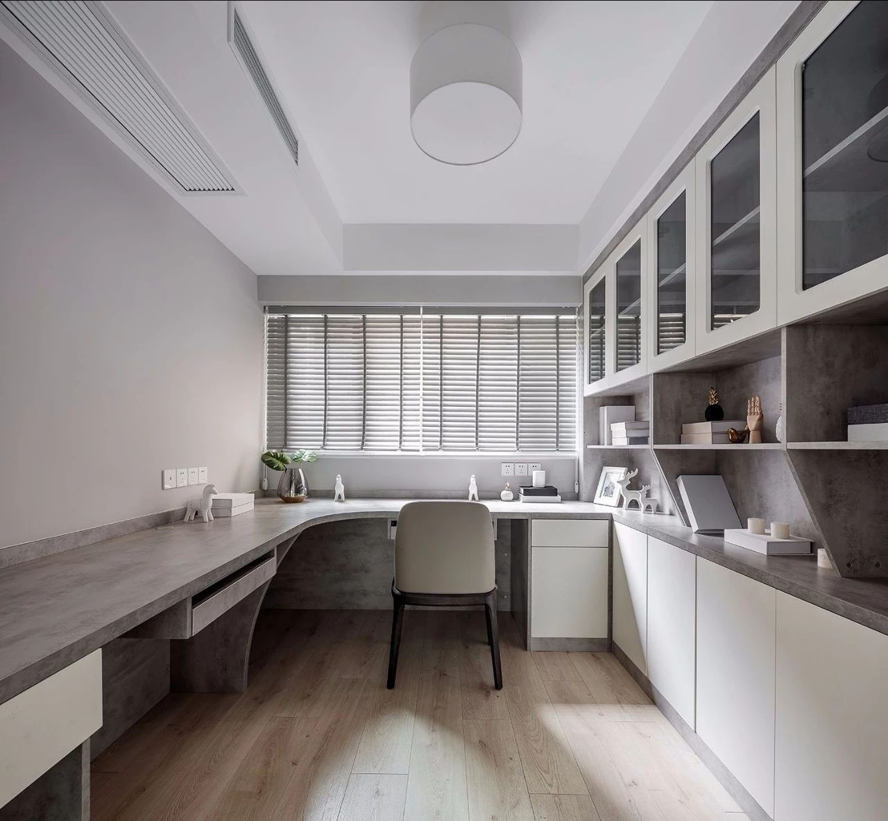 書桌和柜子的搭配非常關(guān)鍵,書桌的上方做玻璃柜,周邊也做儲(chǔ)物柜,這樣書房才能擁有更多的儲(chǔ)物空間,即使不工作的時(shí)候,也非常實(shí)用。