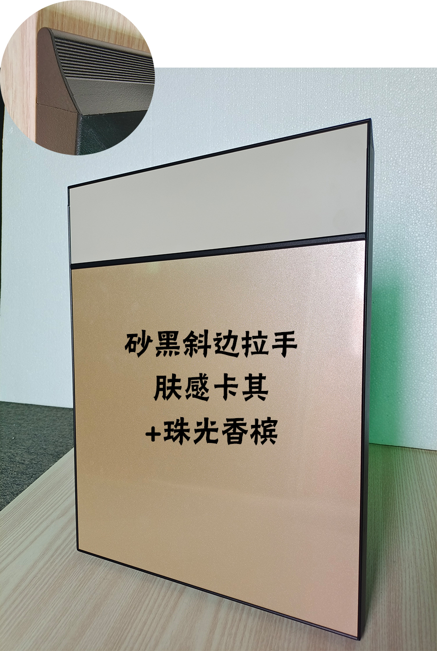 柜門的門框料是斜著變薄的鋁型材,這種設(shè)計(jì)非常高級(jí),既看不到門把手又方便閉合,美觀大方。