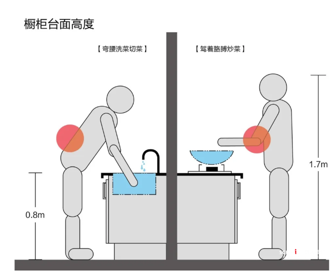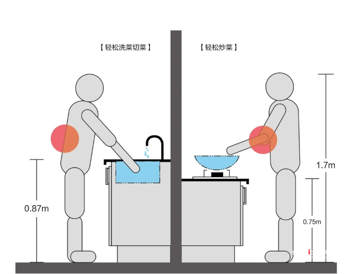 在烹飪時(shí),洗菜切菜和炒菜的動(dòng)作幅度是不一樣的,想要獲得更加舒適的廚房體驗(yàn),可以考慮采用高備餐、低烹飪的方式,這樣才能同時(shí)解放胳膊和頸椎!