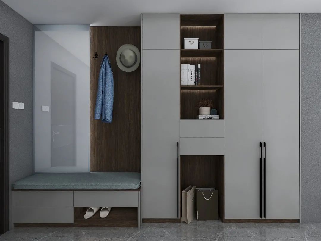 既是隔斷柜又是全鋁鞋柜,一柜到頂,大大增加了收納空間還顯得大氣簡潔。再配上換鞋凳,實(shí)用又美觀。