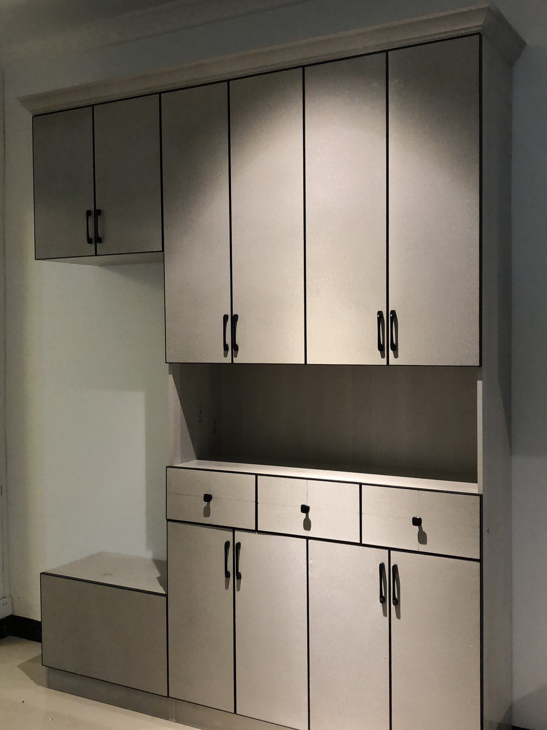 玄關(guān)處大多是全鋁鞋柜和吊柜的一體式,下面是全鋁鞋柜、上面是全鋁吊柜、中間還能留出掛衣服的空間,這樣的設(shè)計(jì)比單純的全鋁鞋柜更人性化。