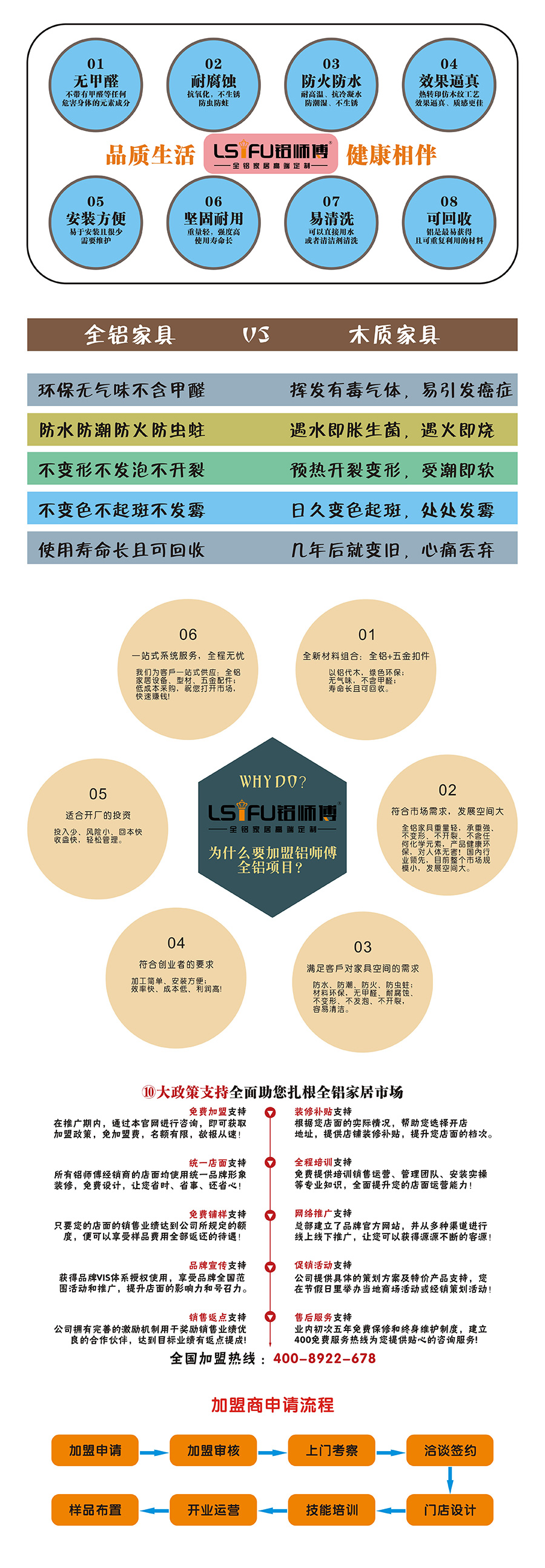 中山李總以前是做鋁合金門窗的,很多的斷橋鋁門窗都是在佛山的廠家拿的貨,大家都知道佛山是鋁材之都,鋁制品還是佛山的比較靠譜有保障些,在與那么多客戶的接觸中他發(fā)現(xiàn)很多客戶都有定做全鋁家具的需求,而且全鋁家居健康環(huán)保防火防水防霉無蟲蛀無甲醛的優(yōu)勢比傳統(tǒng)的板材家具好很多,對全鋁家居高端定制這個市場非??春?,而且隨著老板姓生活水平的提高,對生活品質(zhì)有更高的要求。全鋁家居正符合當代年輕人追求健康時尚的品質(zhì)生活的價值觀,一拍即合!
