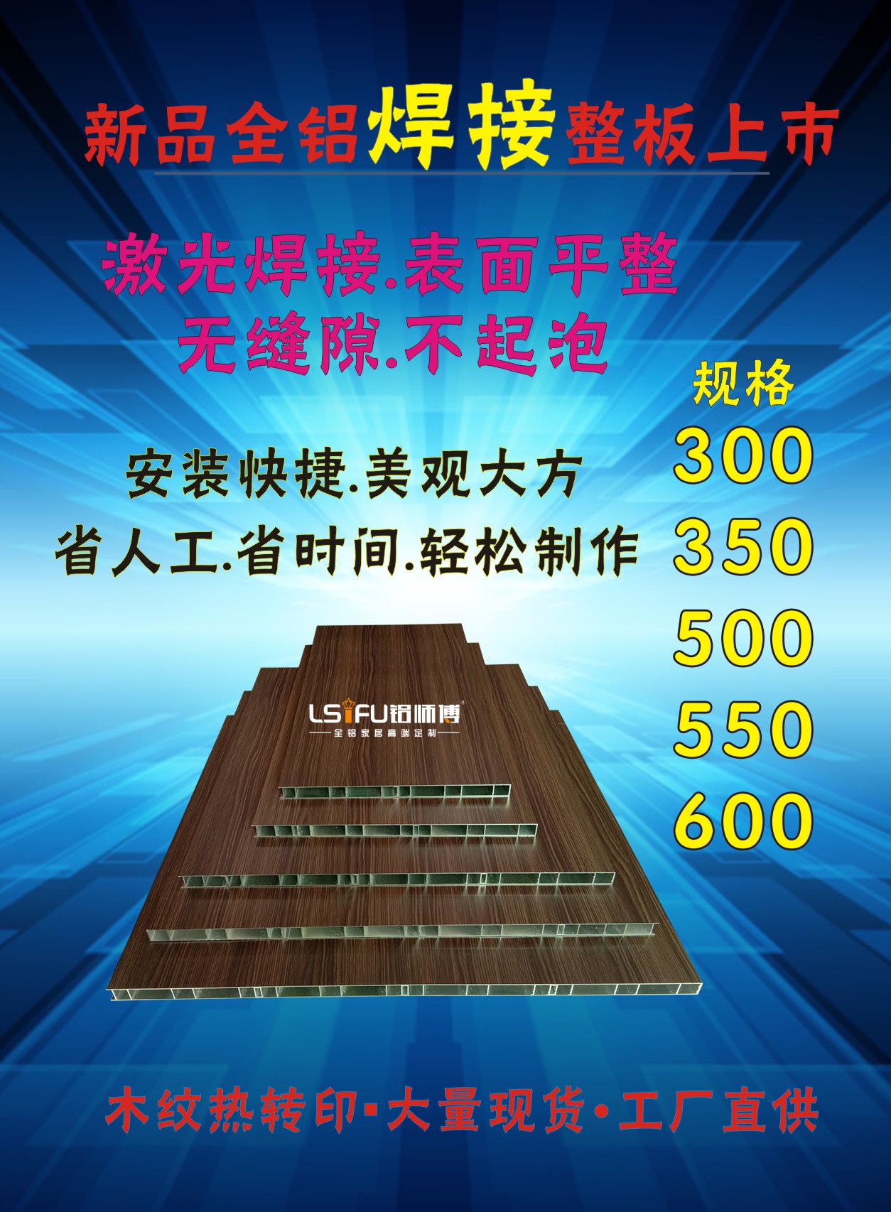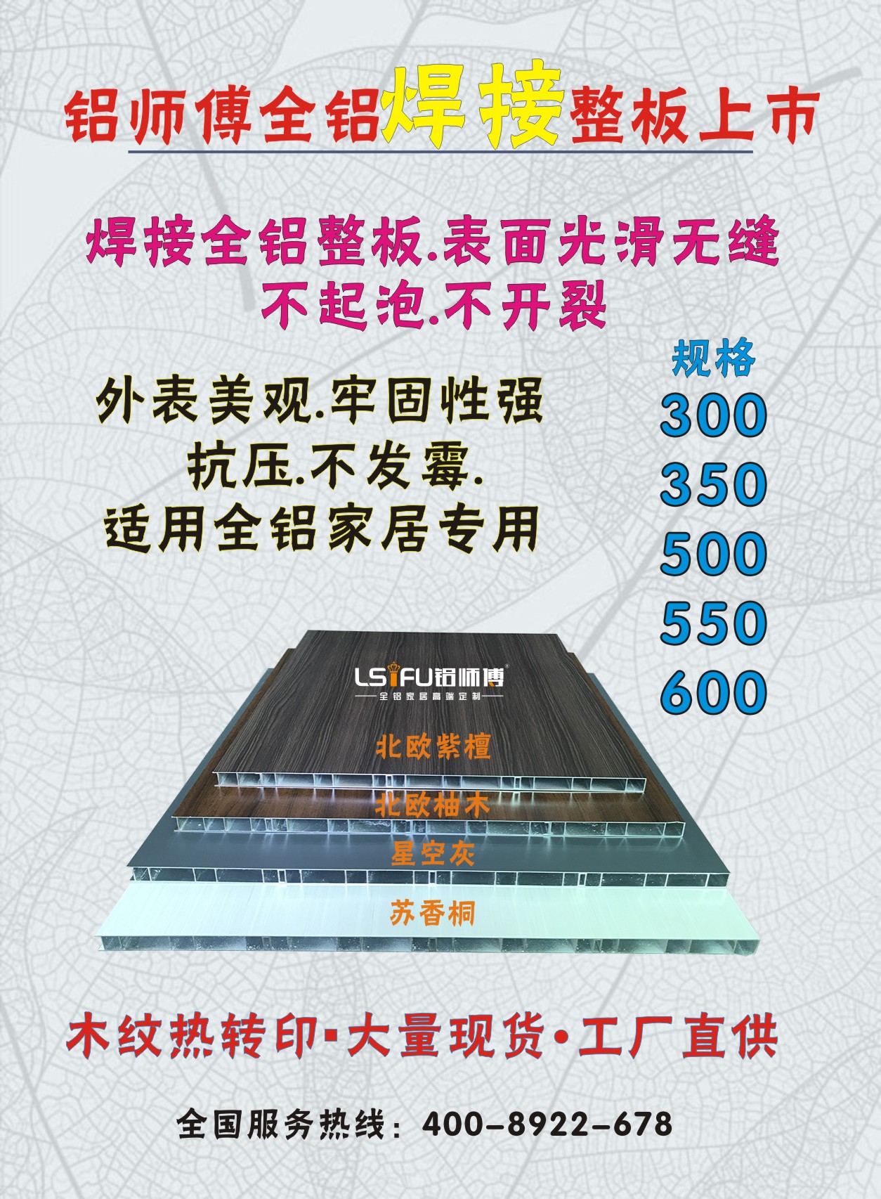 鋁師傅全鋁焊接整板目前有蘇香桐、星空灰、北歐紫檀、北歐柚木四種顏色,后續(xù)還有顏色增加,規(guī)格有300mm,350mm,500mm,550mm,600mm五個(gè)寬度的尺寸,長(zhǎng)都是6米。如果你想了解更多關(guān)于全鋁焊接整板的信息可以撥打我們網(wǎng)頁(yè)下方的400-8922-678全國(guó)服務(wù)熱線,歡迎廣大客戶來(lái)電咨詢!