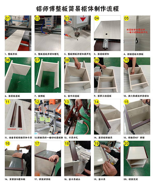 2、那整板家具怎么制作組裝呢?下面是我們鋁師傅全鋁焊接整板的一個簡易柜體的制作流程: