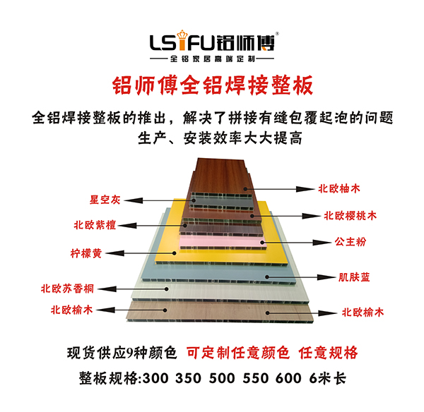 鋁師傅全鋁焊接整板的推出受到很多客戶的喜愛,但也反映整板的顏色有點少滿足不了多樣化的客戶需求,所以我們由一開始推出的4色后來增加到6色,最近我們又推出了3種輔色,所以現(xiàn)在一共有9個顏色,由6大主色和3大輔色組成。