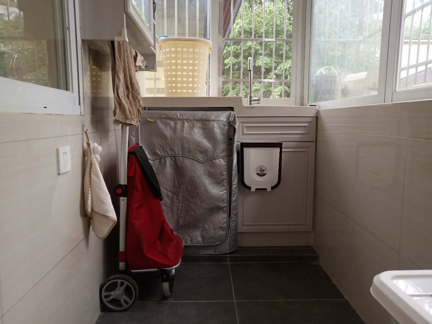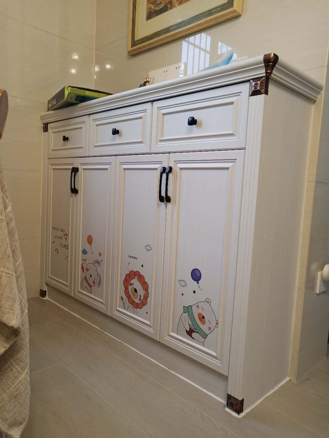 陽臺(tái)的另一邊定制的是嵌入式洗衣機(jī)柜。整個(gè)房子考慮到大人小孩的東西比較多,所以柜子比較多,整體顏色都是白色系的,所以主人買了很多卡通貼畫貼在柜子上,整體更加溫馨可愛!