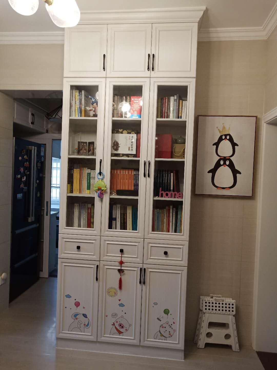 通頂書柜,下面放文具等文件用品,中間是透明的玻璃柜,要找的藏書一目了然,拿取方便,頂柜放不常用的東西。