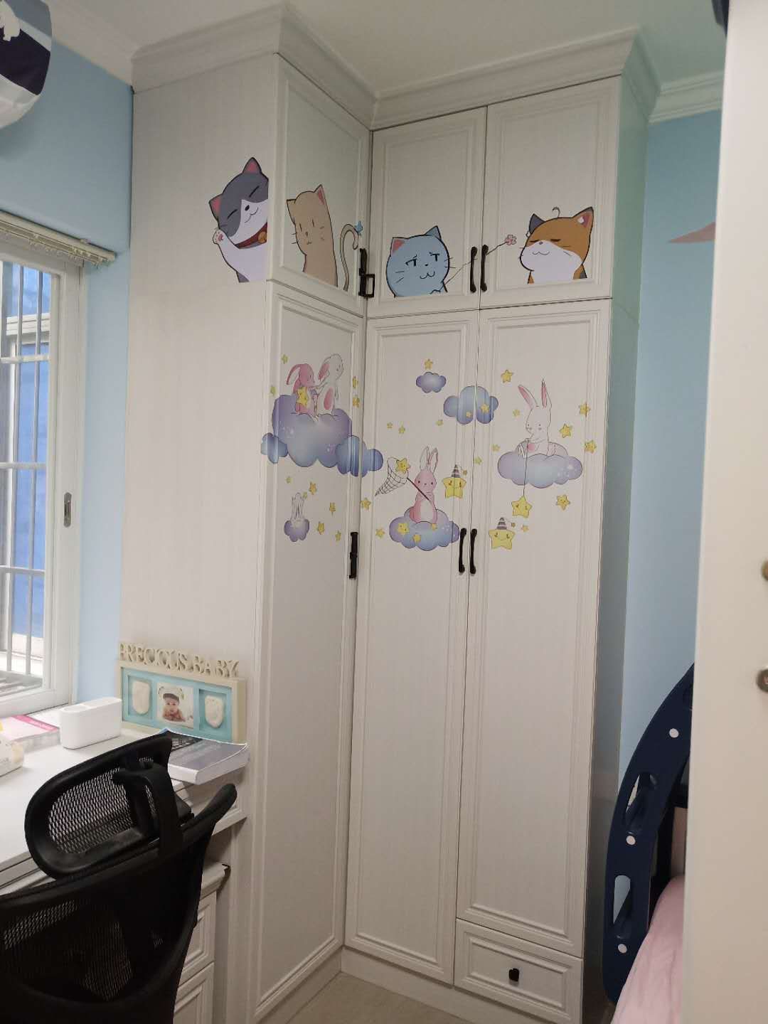 這是另一兒童房,根據(jù)戶型擺設(shè)定制了兩個(gè)轉(zhuǎn)角衣柜。