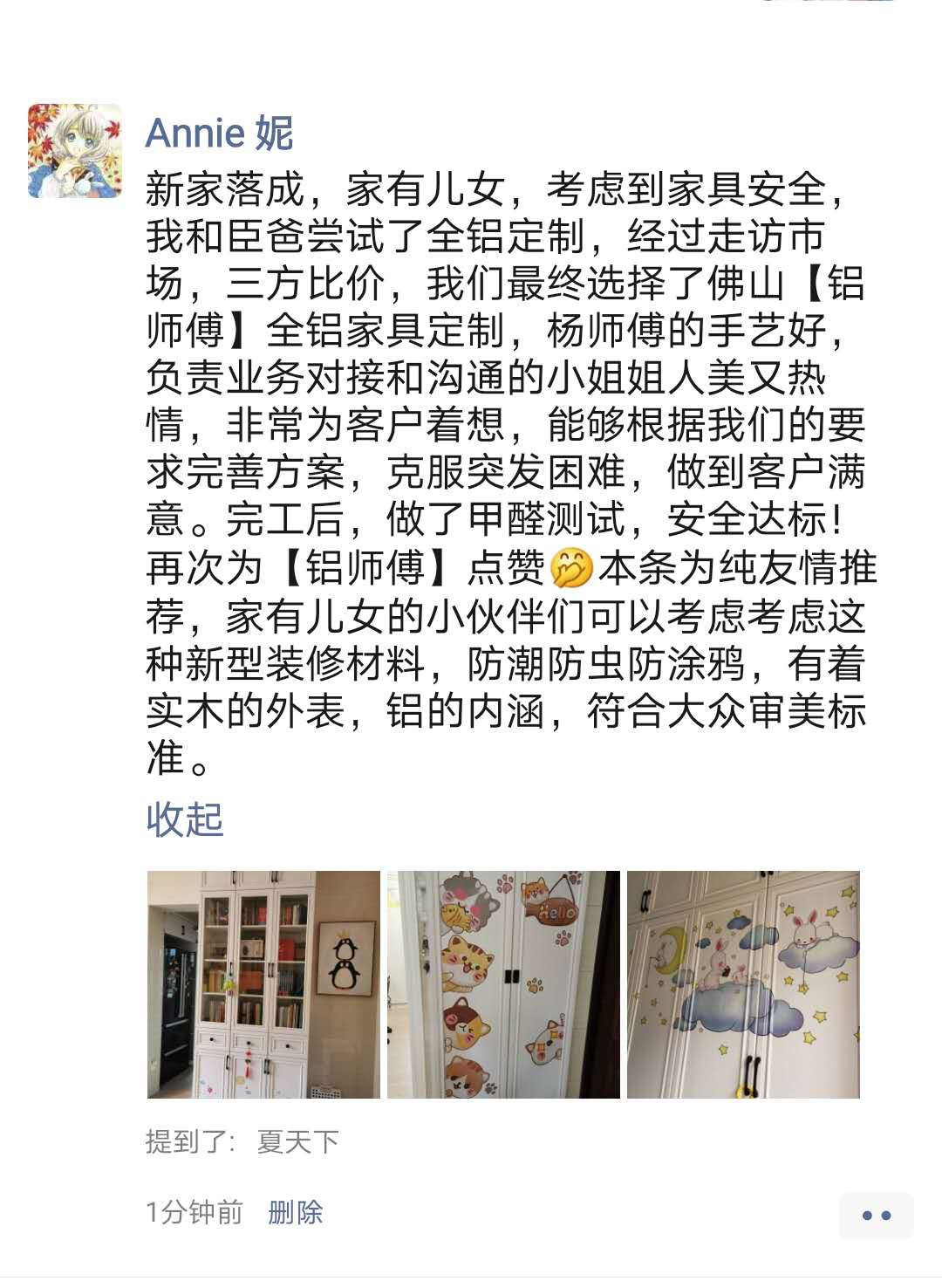 感謝夏太太對(duì)我們歐格美鋁師傅全鋁家居的高度評(píng)價(jià),感謝信任!我們會(huì)一如既往的用好產(chǎn)品好服務(wù)回饋給廣大客戶朋友,歡迎來電咨詢!