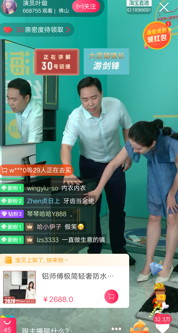 5.23號(hào)晚大瀝鎮(zhèn)長(zhǎng)和葉璇為鋁師傅全鋁衛(wèi)浴柜帶貨