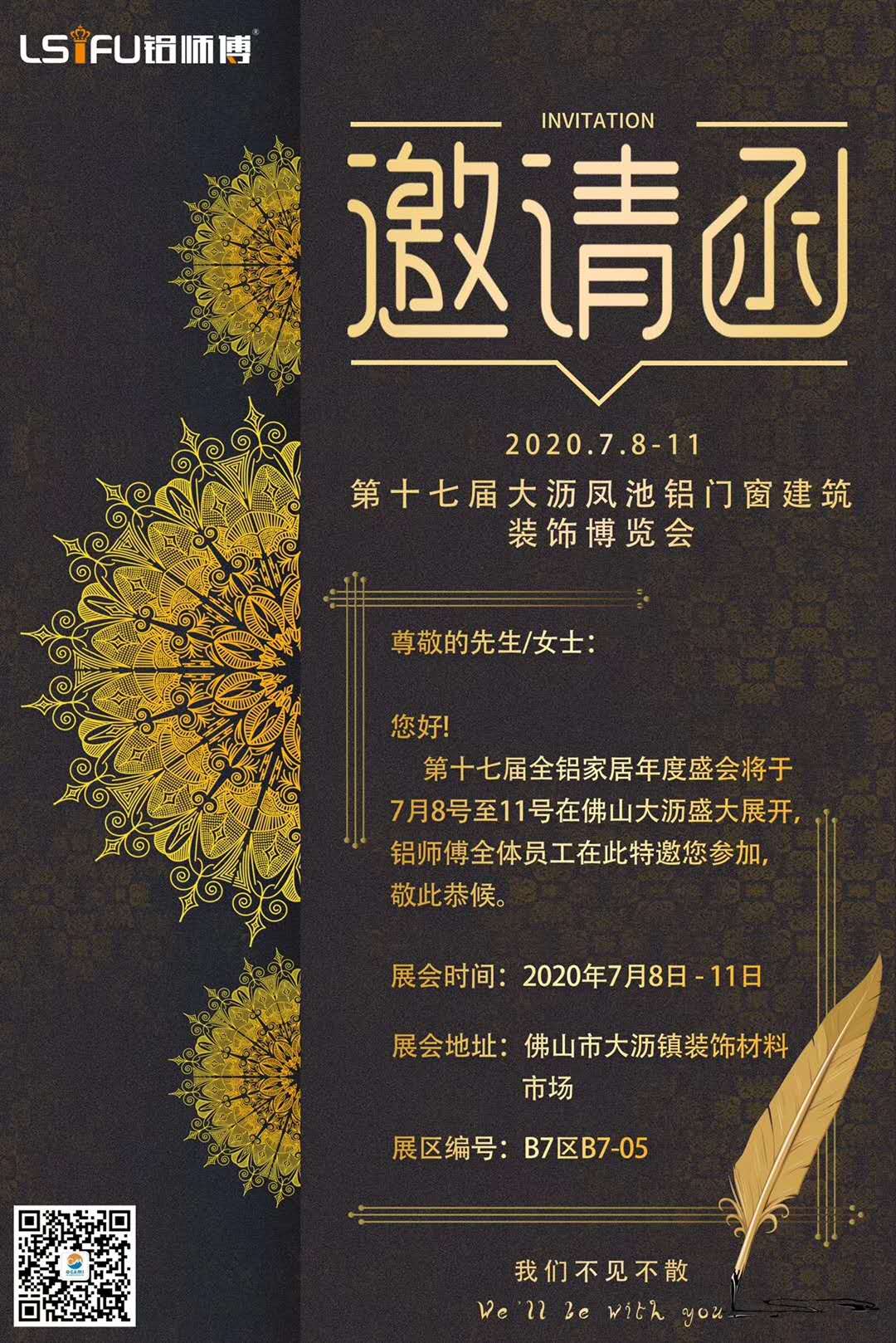 第十七屆大瀝鳳池鋁門窗建筑裝飾博覽會(huì)將在2020年7月8日-11日舉行,鋁師傅全鋁家居誠(chéng)摯邀請(qǐng)您參加!我們的展位在B7區(qū)B7-05,超多新品推出,敬請(qǐng)期待!