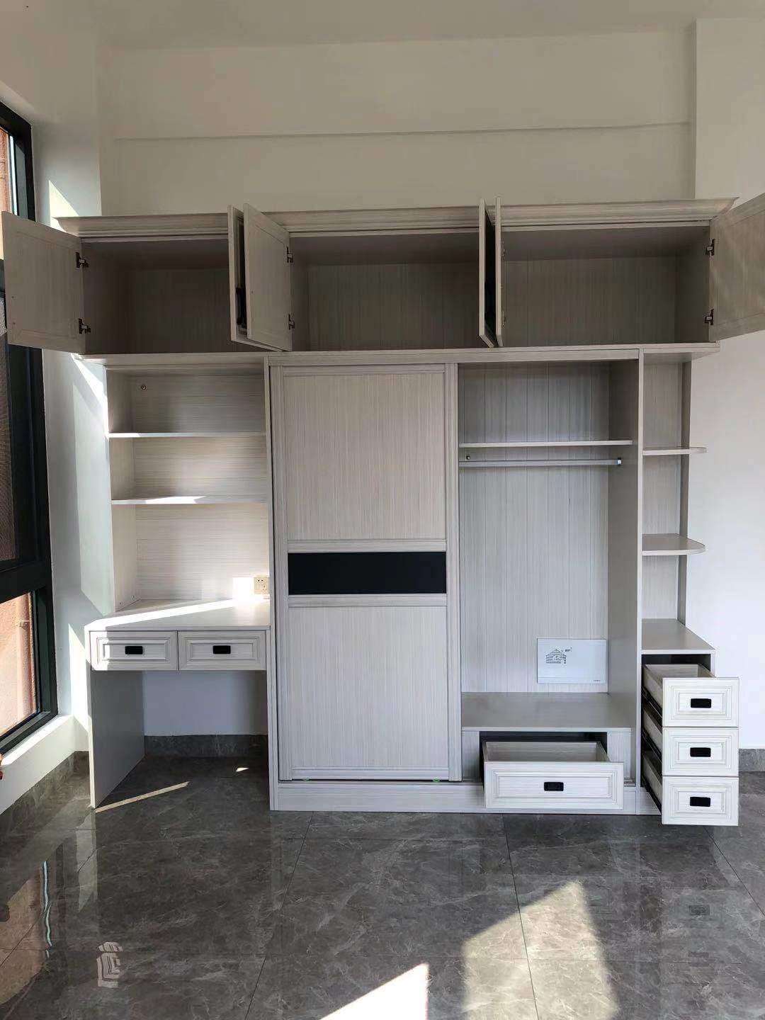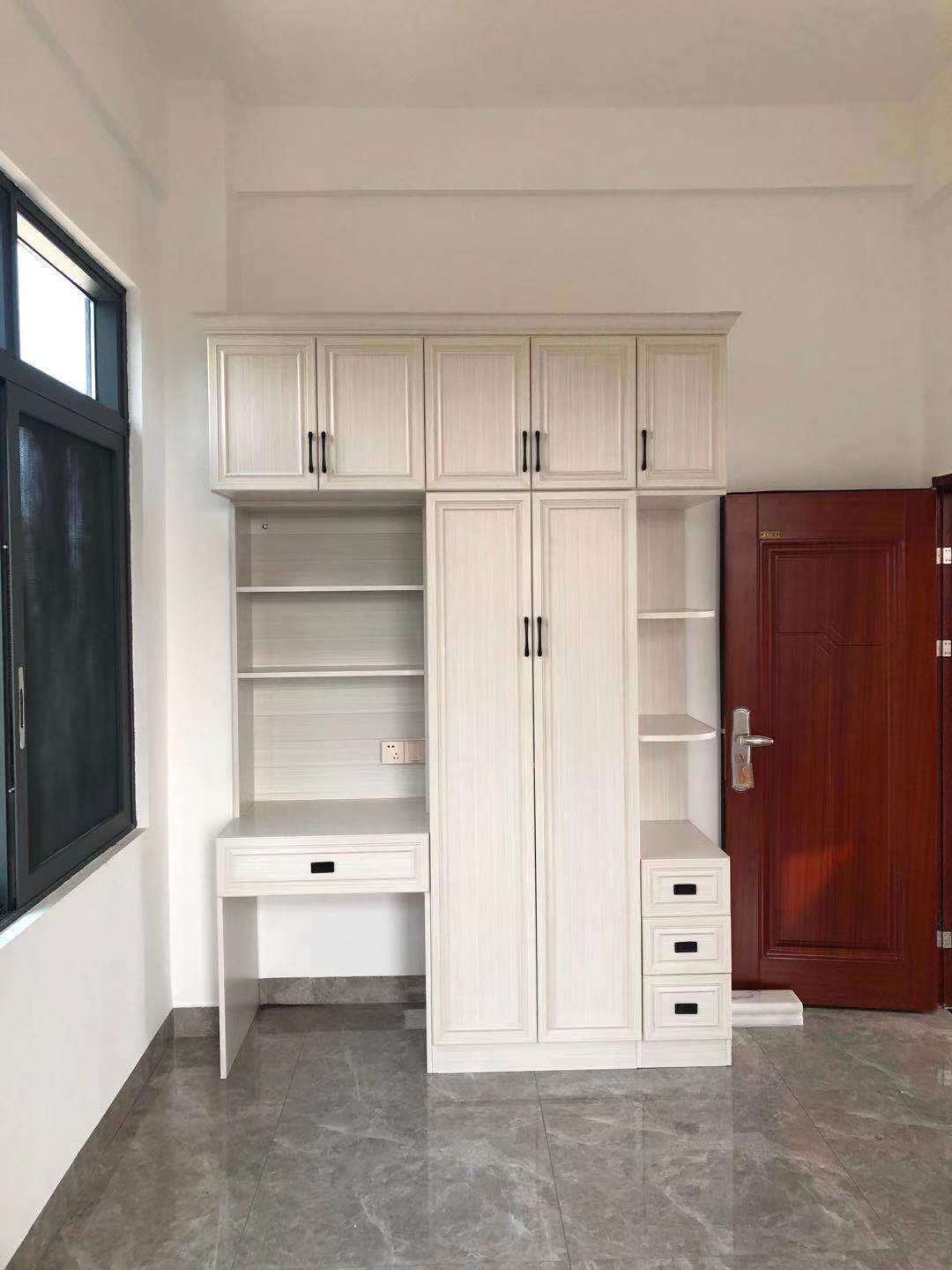 這是3樓女兒房掩門衣柜,與兒子房衣柜同一色系,也是衣柜+書桌組合,一邊半圓弧開放格+抽屜,實(shí)用。