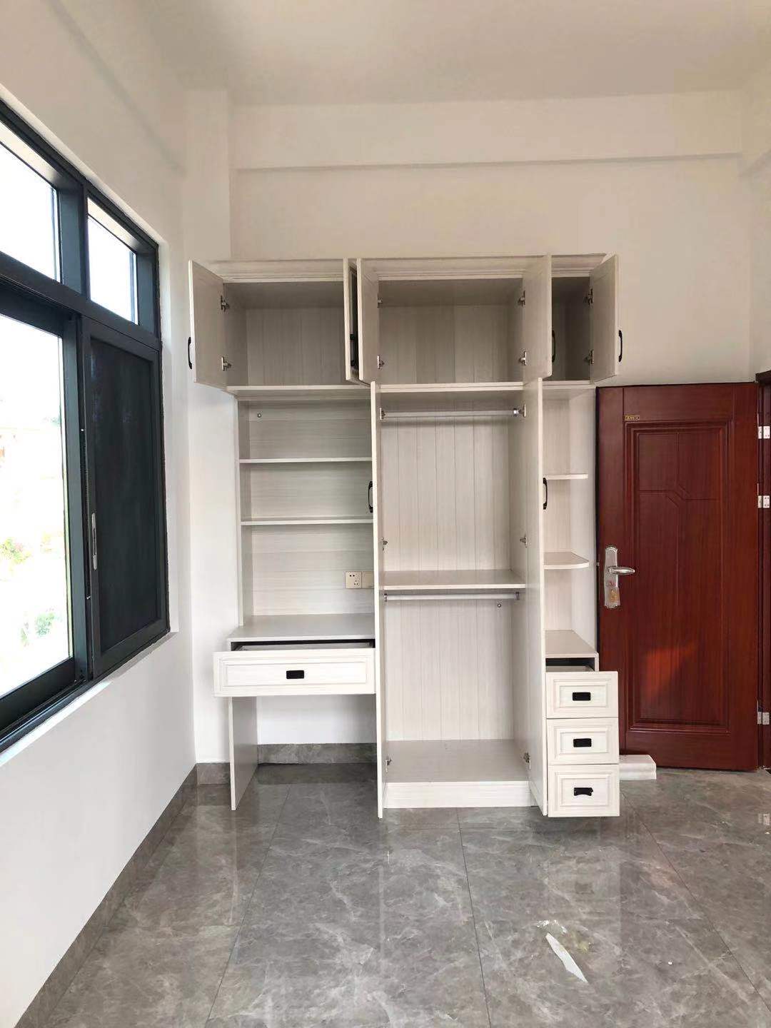 這座房子位于海南陵水縣,考慮常年比較潮濕,家具防潮是考慮的重點(diǎn),所以業(yè)主選擇防水防潮防蟲蛀好打理的全鋁家具。自建房一共有四層,每層層高3米多,所以柜子家具也沒必要做到頂,做到頂反而由于太高會給后期使用帶來不便和浪費(fèi)。