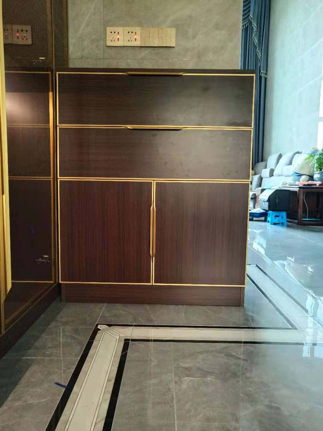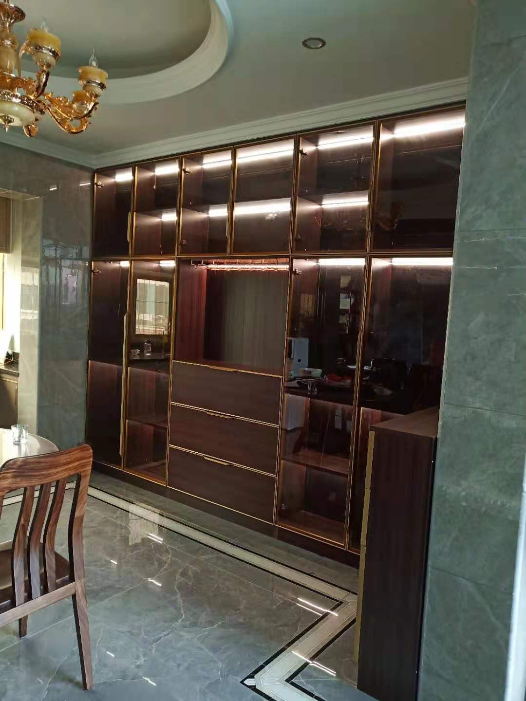 這是一套復(fù)式結(jié)構(gòu)的房子,分上下兩層。上圖是餐廳的餐邊酒柜(拍照效果沒有實(shí)物漂亮),柜體是深色木紋色北歐紫檀,內(nèi)嵌感應(yīng)燈帶,搭配金色20極簡窄框玻璃門,盡顯輕奢質(zhì)感!