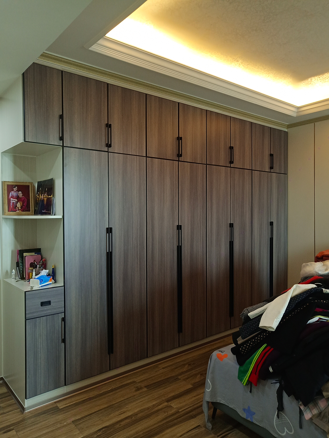 這是兒子房另一邊的一字型到頂掩門衣柜,以后結(jié)婚了,夫妻可以各用一個(gè)衣柜,再也不用擔(dān)心衣服裝不下了。大家可能發(fā)現(xiàn)了這家業(yè)主的衣柜開放格設(shè)計(jì)與之前分享的有些區(qū)別,之前的衣柜都是整邊做成圓弧開放格,現(xiàn)在的衣柜只在一邊的中間挖空做個(gè)2-3層的開放格,這樣更美觀也不會(huì)造成浪費(fèi),開放格下邊做成抽屜和掩門柜子更美觀科學(xué)。