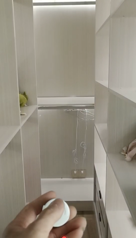 這是女兒房的一個(gè)隱藏式衣帽間,三扇移門里面是一個(gè)小型衣帽間,內(nèi)部容量超大,可放鞋子、包包等各種衣物。里面也裝了智能燈帶,用起來非常方便。