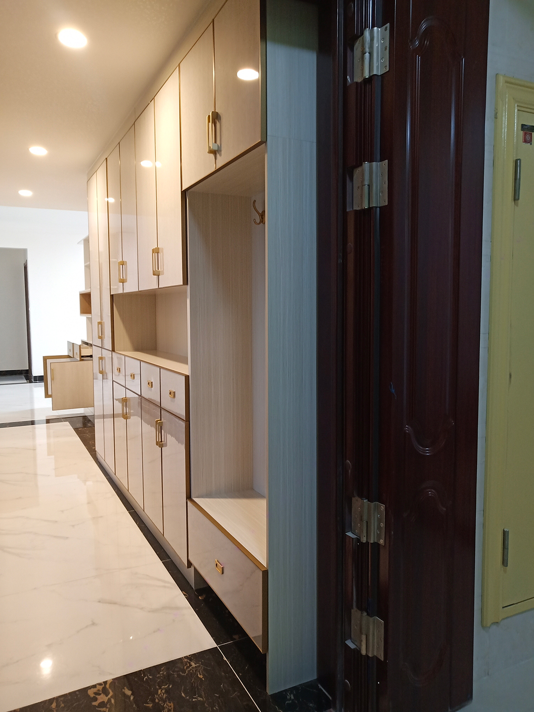 入戶玄關(guān)做了一個多功能頂天立地式大鞋柜,白色系北歐書香桐柜體搭配PET高光蜂窩板極簡門板,用金色窄邊門框和金色拉手點(diǎn)綴,非常高級。中間挖空+換鞋凳+掛衣鉤設(shè)計(jì),回家隨手放鑰匙包包,脫外套坐著換鞋非常方便,推開家門,卸下一整天的疲憊,回到溫馨的港灣。