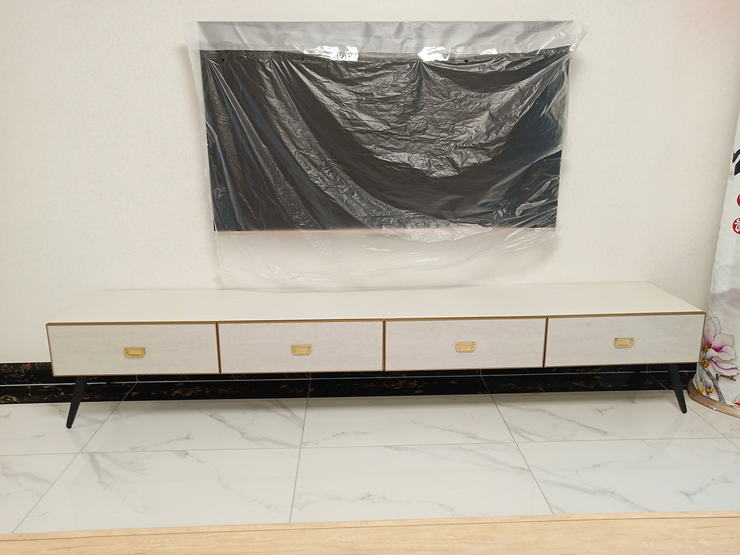 沙發(fā)對面的墻面裝了壁掛式電視,在電視下方做了極簡長方形電視落地柜,顏色與玄關(guān)鞋柜一致,細(xì)角設(shè)計(jì)減少厚重感,非常美觀!