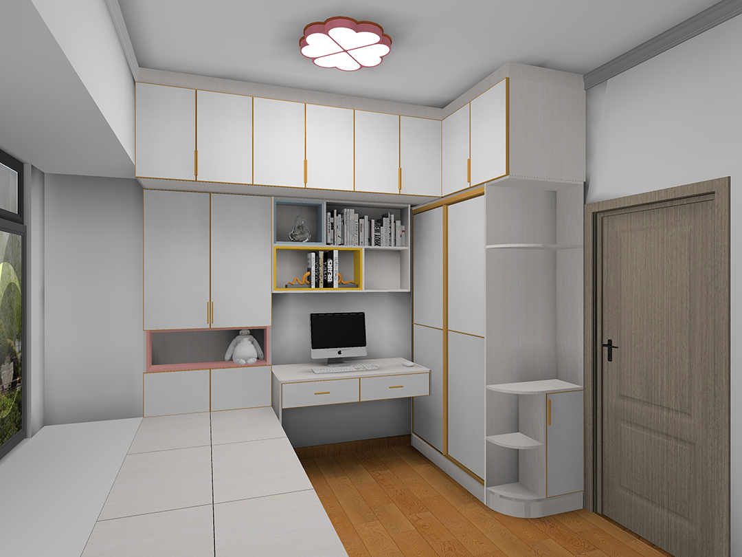 用肌膚藍(lán)、檸檬黃、公主粉三個嵌入開放格做點(diǎn)綴,迎合少女活潑可愛的氣質(zhì),整個柜體把空間利用極致。