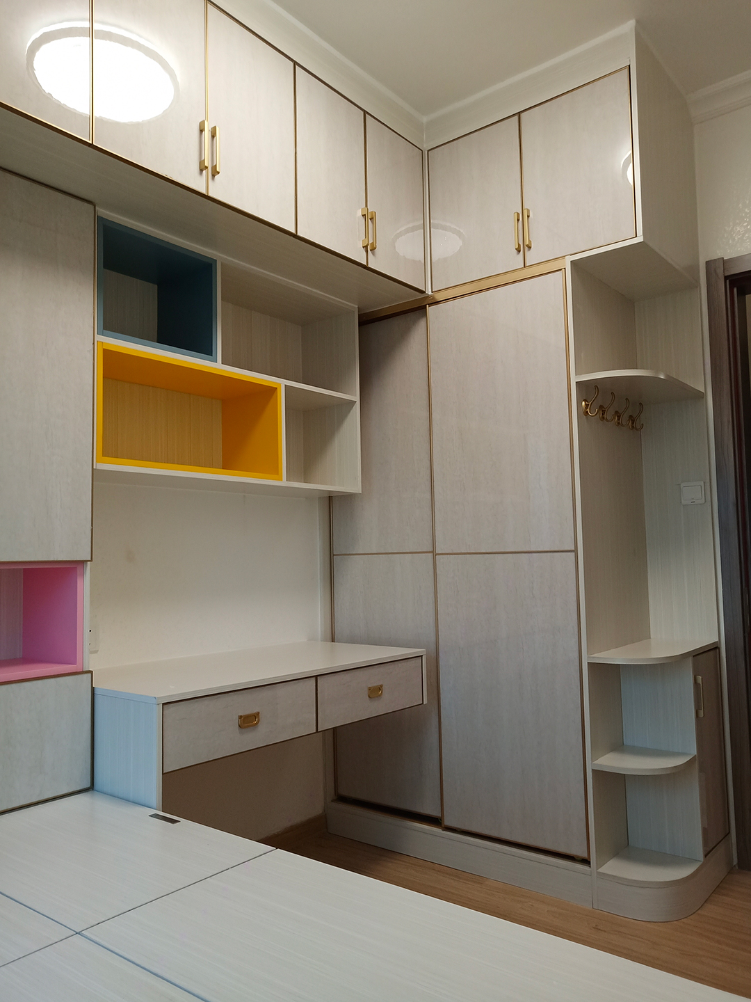 女兒房利用飄窗做了一個與飄窗齊平的全鋁榻榻米床+書桌柜+移門衣柜組合,顏色與整屋柜體一致,收納非常足,再多的衣物和書籍都能裝下。