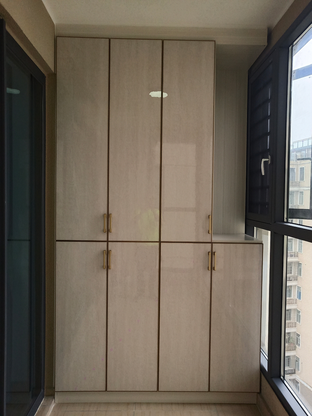 陽臺的另一邊定制了一個儲物柜,柜子顏色與整屋一致,線條感十足,簡單大方上檔次!