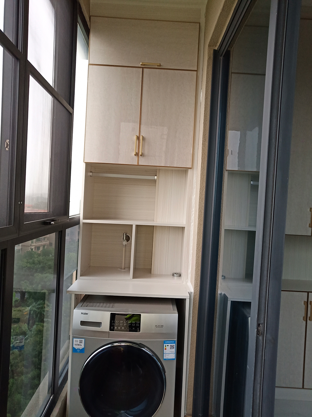 陽臺的空間也不讓費(fèi),一邊定制陽臺洗衣機(jī)柜,洗完衣服直接晾曬非常方便,還能把管道都隱藏在柜體內(nèi),還陽臺一個整潔美觀!