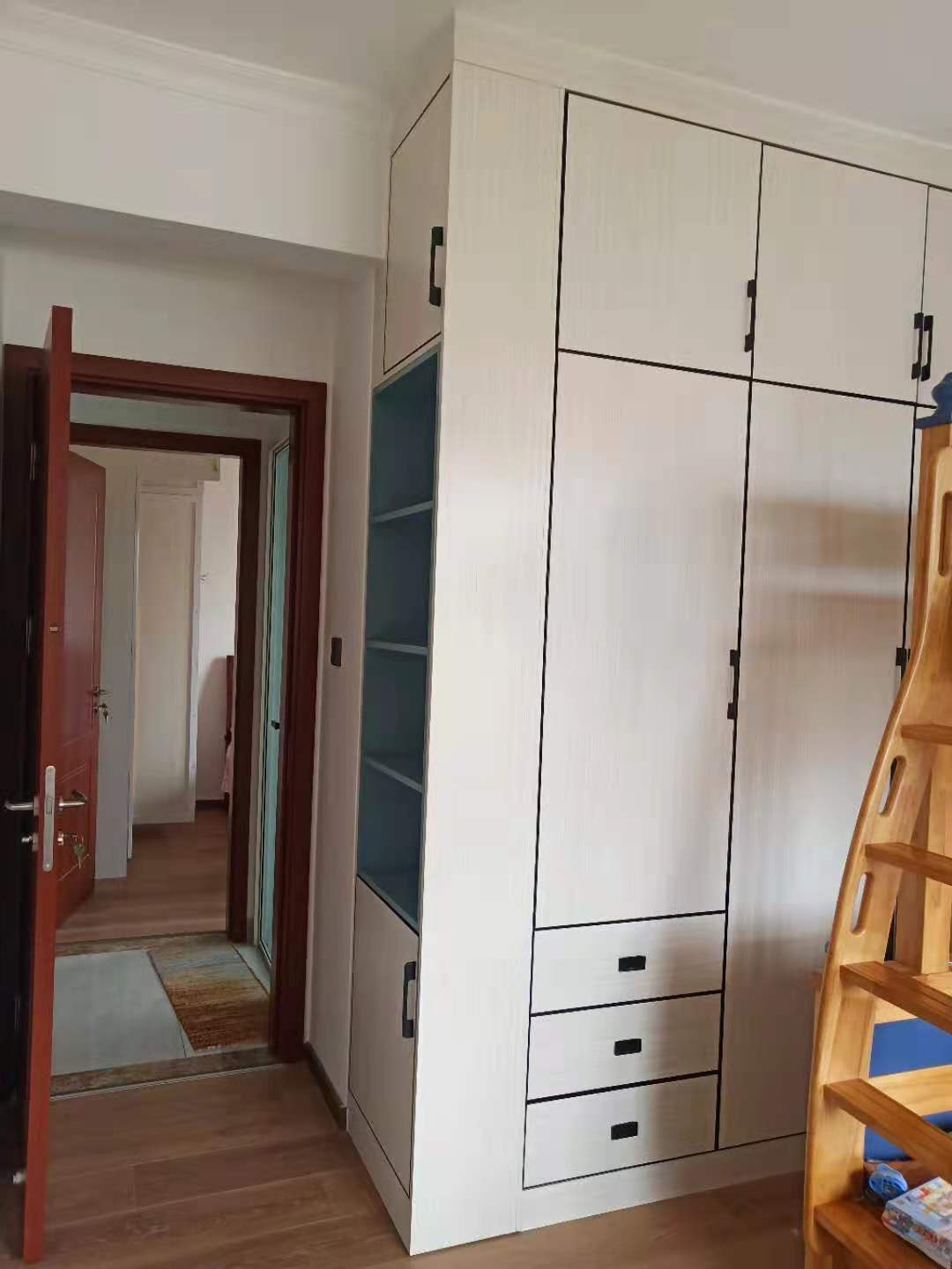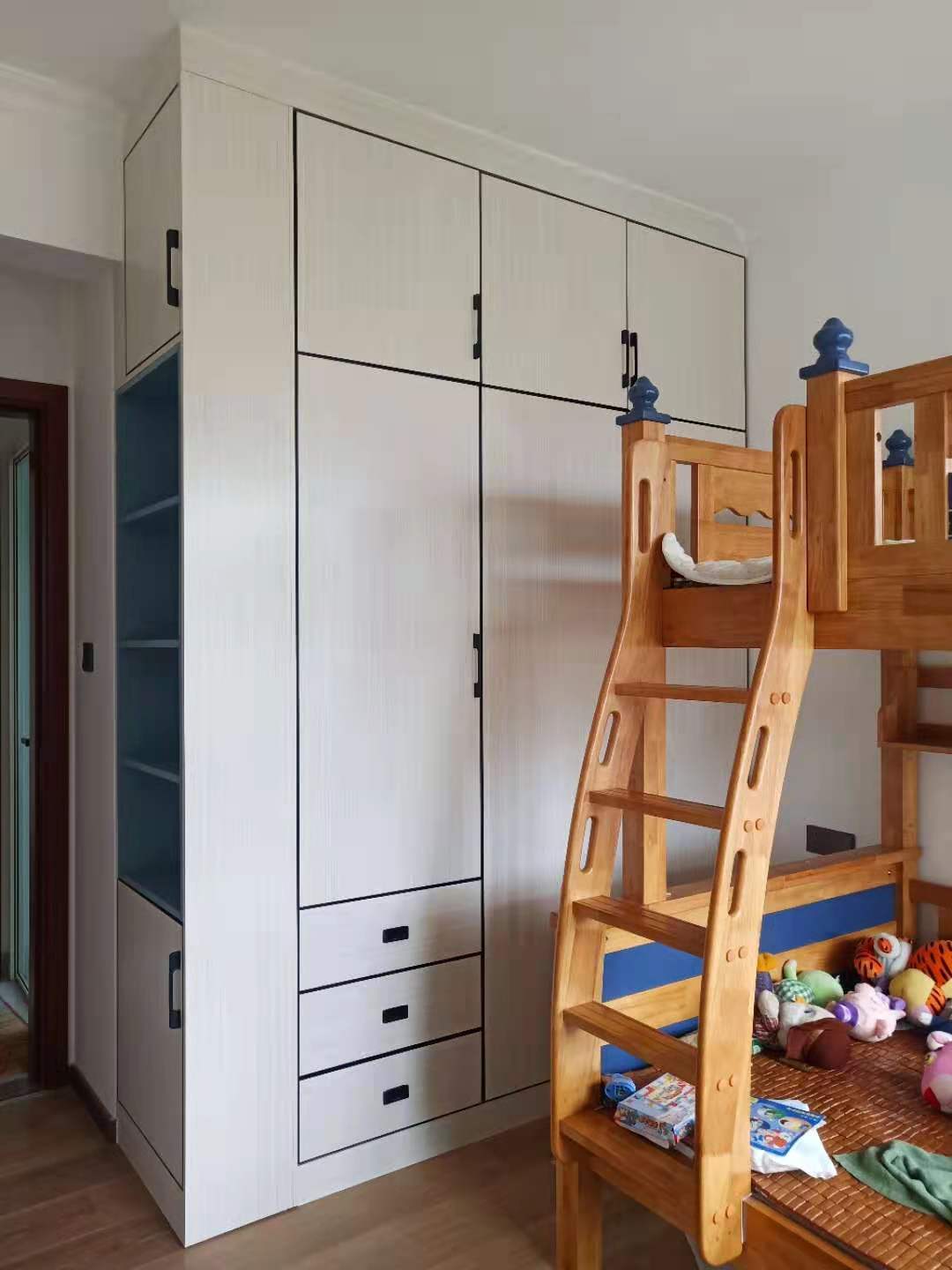 大女兒房做了一個轉(zhuǎn)角衣柜,柜體是焊接整板北歐書香桐,門板是用北歐書香桐蜂窩板做的衣柜門和抽屜門更輕便??块T的一邊做了一個整板肌膚藍內(nèi)嵌開放格做跳色,白色系柜體搭配黑色極簡邊框門板,線條感十足。