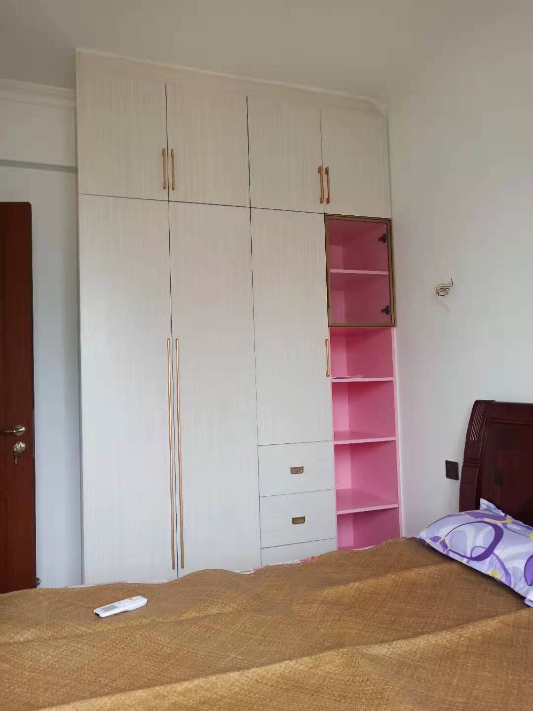 小女兒房衣柜柜體和門板與大女兒房一致,也是用的北歐書香桐,不同的是在靠近床頭的一邊做了一排內(nèi)嵌公主粉開放格,即可充當(dāng)床頭柜,又迎合美少女粉粉的氣質(zhì)。
