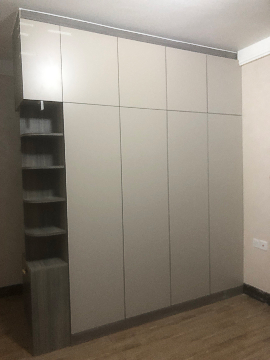 衣帽間背面靠床的一側(cè)做的是假門,假門用的是赴港卡其色更溫馨。