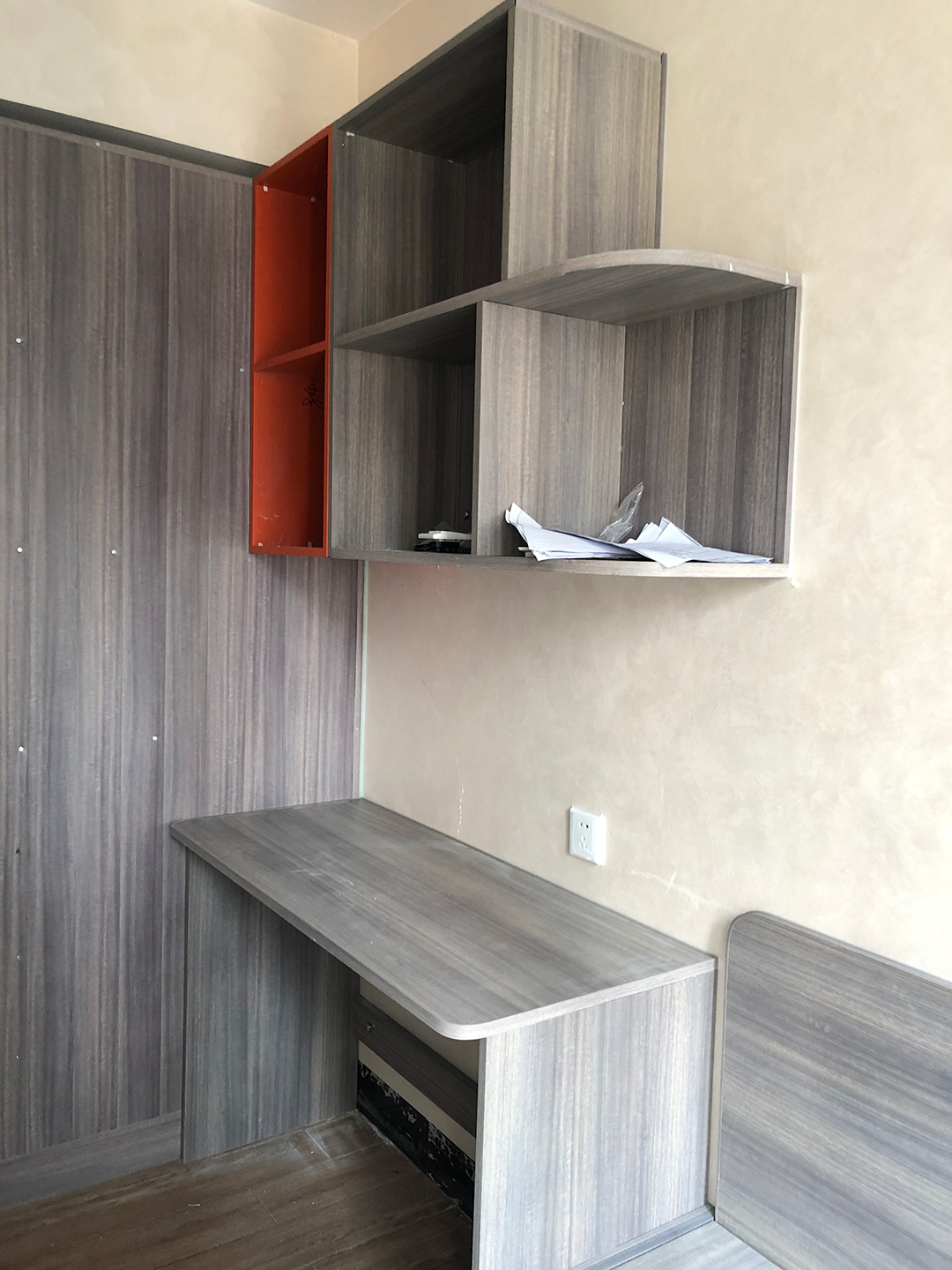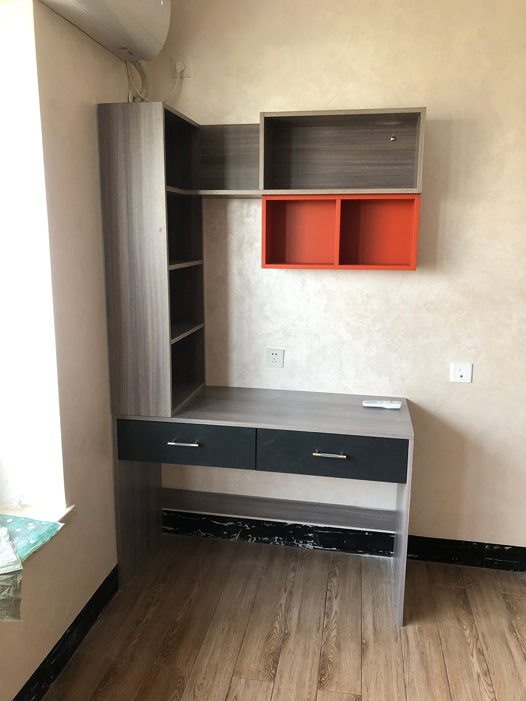 床的對面靠窗做了一個(gè)書桌柜,還可以當(dāng)梳妝臺用,北歐松木灰柜體搭配膚感深灰色隱框門板,書桌上的吊柜做開放格,放書籍拿取更方便,兩個(gè)愛馬仕橙開放格做點(diǎn)綴,整體更有層次感。