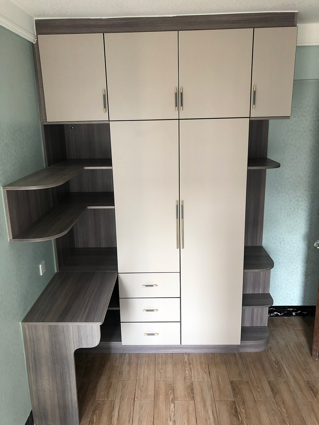 兒子房家具是全鋁衣柜+書桌柜組合,封閉與開放相結(jié)合,焊接整板北歐松木灰搭配膚感卡其門板,金色圓柱拉手做點(diǎn)綴,邊角圓弧設(shè)計(jì)更人性化。