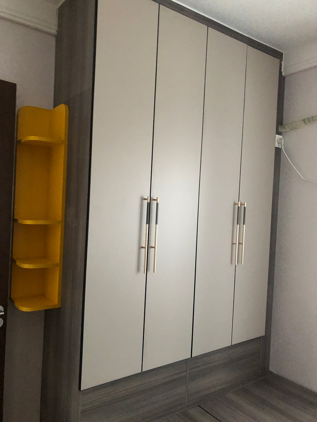 女兒房定制了一個(gè)榻榻米床+ 床頭衣柜組合,柜體與整屋顏色一致,衣柜柜體是北歐松木灰,柜門是膚感卡其門板搭配金色圓柱拉手,靠門一邊定制了一個(gè)檸檬黃圓弧小架子做點(diǎn)綴。