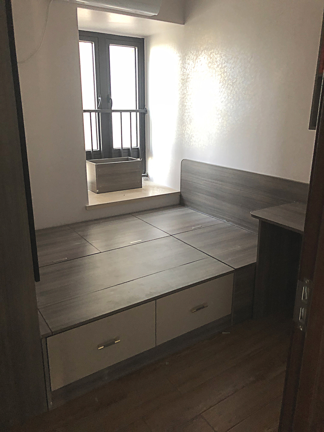書桌旁是榻榻米床,榻榻米床上方做了一個(gè)大吊柜當(dāng)衣柜(如下圖)
