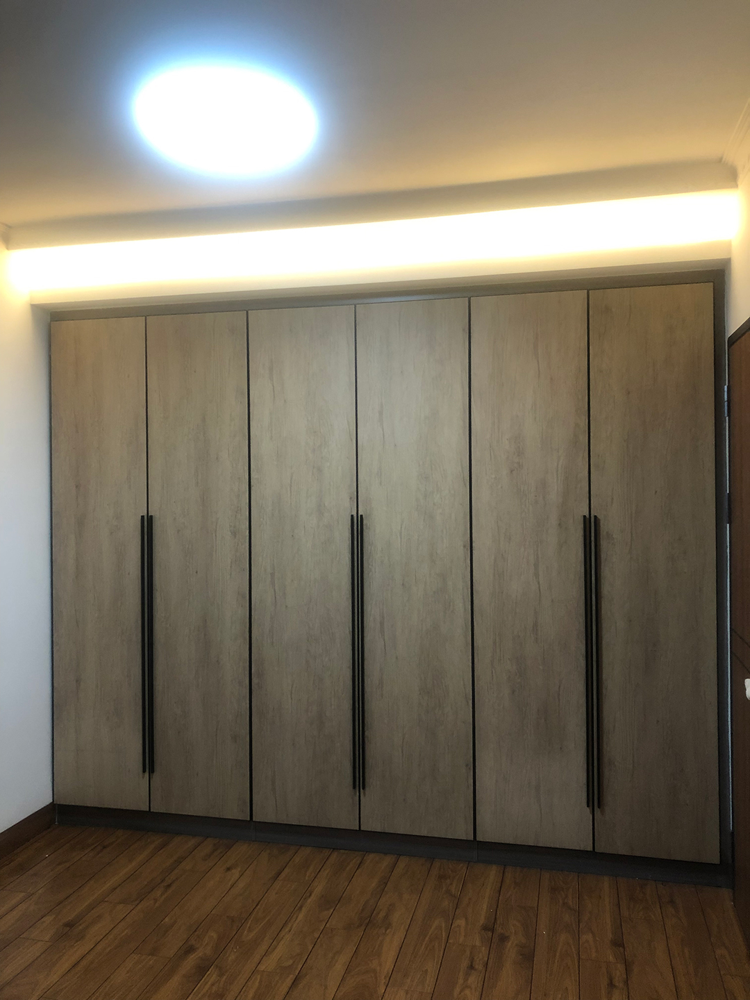 主臥入室左邊是嵌入式衣柜,與墻體平行,門(mén)板也是歐式63框北歐書(shū)香桐,用金色拉手點(diǎn)綴,盡顯質(zhì)感。