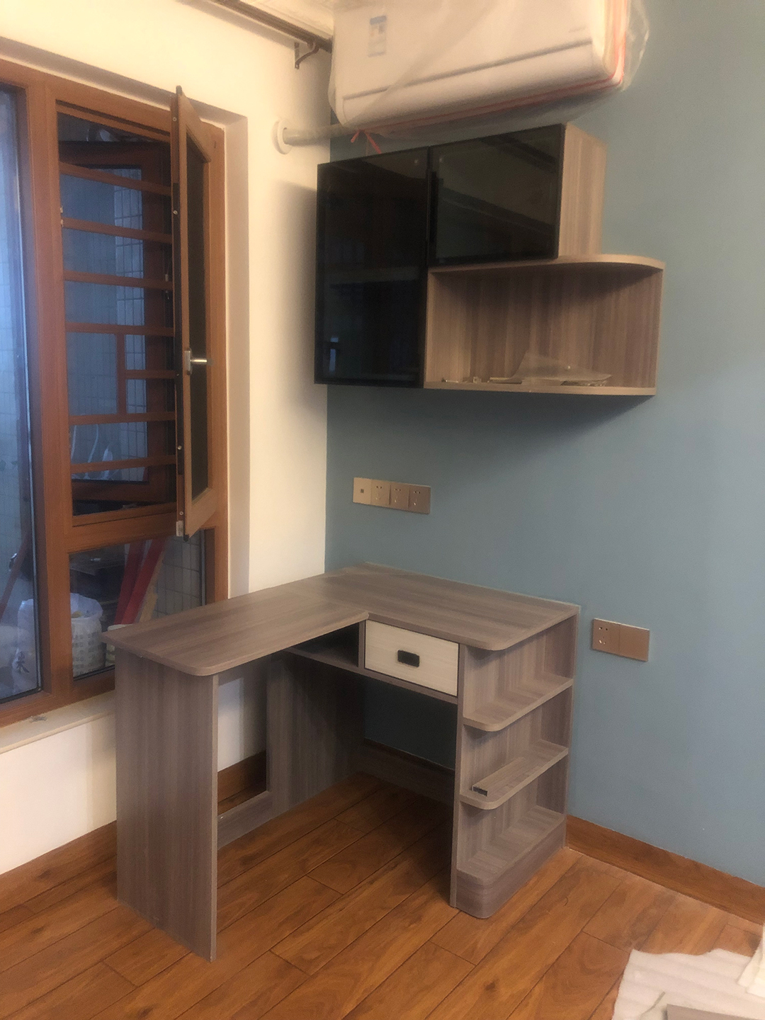在靠窗的地方也做了一個(gè)轉(zhuǎn)角書(shū)桌柜,抽屜+一邊開(kāi)放格設(shè)計(jì),收納充足,柜子風(fēng)格與整屋一致。
