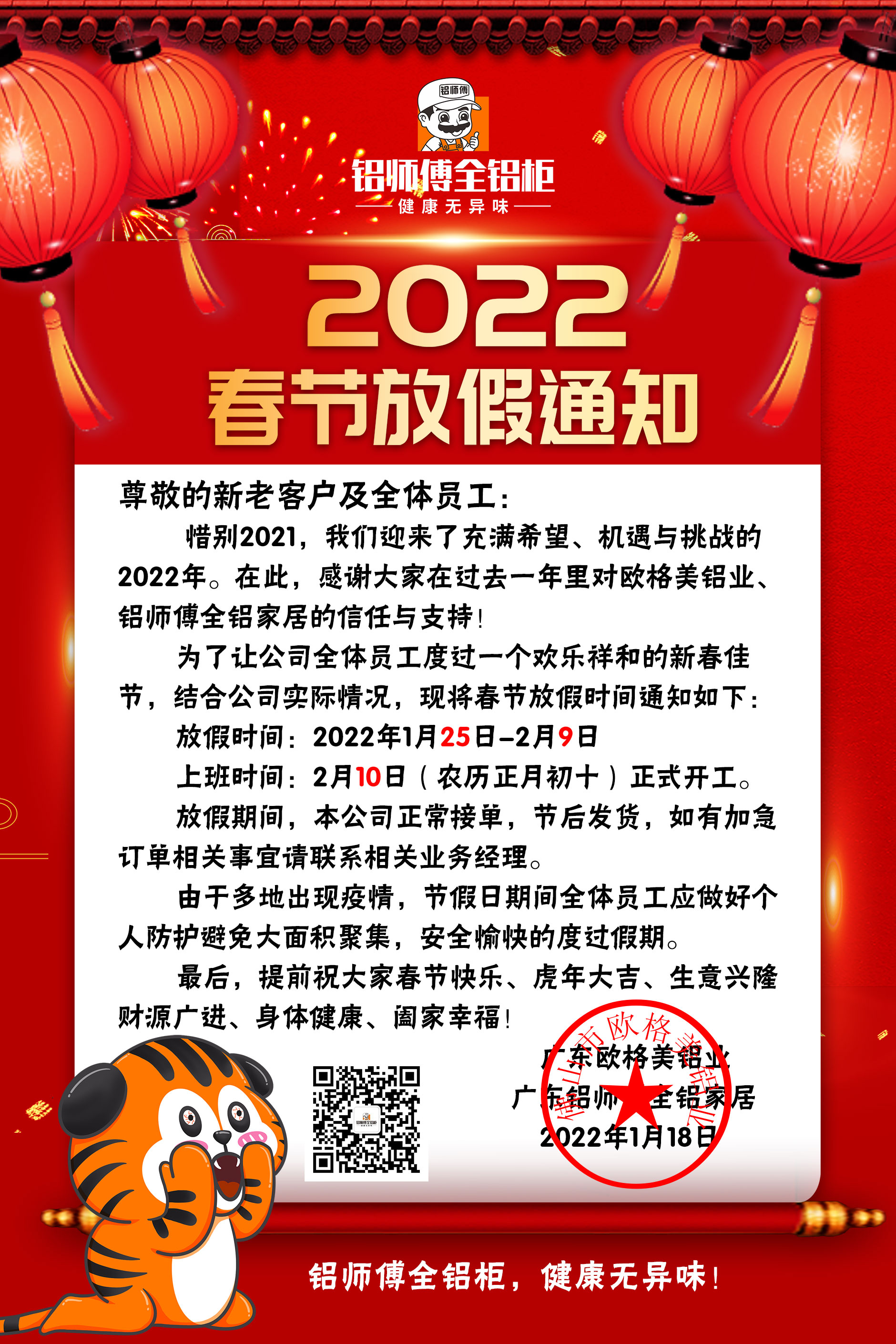 惜別2021,我們迎來了充滿希望、機(jī)遇與挑戰(zhàn)的2022年。在此,感謝新老客戶朋友們在過去一年里對歐格美鋁業(yè)、鋁師傅全鋁家居的信任與支持!